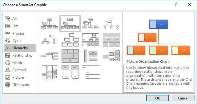 Click on Hierarchy and select the organizational chart format you want to use (note that clicking the SmartArt graphic will load up that graphic’s description). PowerPoint includes a quite useful feature, the SmartArt graphic. A hierarchy graphically represents a series of ordered groupings of people or things within a system.